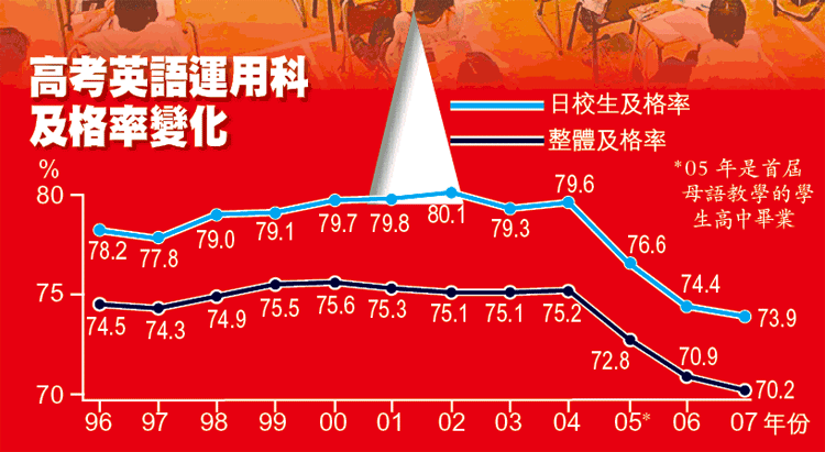 作為母語教學成效指標的英語運用科,整體考生及格率(取得E級或以上)由去年的70.9%跌至70.2%,是96年來新低。日校考生及格率由74.4%降至73.9%。中國語文及文化科及格率也較去年微跌0.1個百分點。