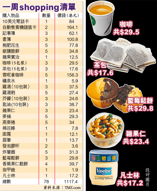 與此同時,著名娛樂網站TMZ.com取得Paris於上周在獄中的購物清單,向來予人洗腳唔抹腳的Paris,在獄中仍不改豪花本色,短短一周內瘋狂購入78件貨品,當中包括大量飲品、零食及日用品,共值1117.4港元,本身擁有個人美容品牌的Paris,竟要於獄中購入價值12元港幣的面霜、13元的眉筆,實在有失豪門千金的身份。