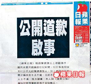 10月,天平邨三母子墮樓事件主角陳健康北上尋歡,《蘋果》其後就記者出錢予陳嫖妓以頭版刊出全版道歉啓事