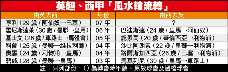將於7.1慶賀生辰的雲尼斯達萊,去季遭曼聯賣走,今季瞬即在皇馬重拾第二春,既成為聯賽神射手,亦協助球隊重奪失落了3季的西甲錦標;與之類同的例子,還有西維爾前鋒簡路廸、維拉利爾的烏拉圭國腳科蘭等,當然,震驚全球的今夏轉會,必然是快將「3字頭」的亨利,從「兵工廠」出走巴塞隆拿。
