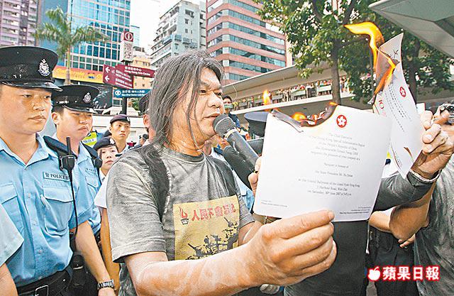 遊行隊伍抵達入境事務處大樓外時,警員阻止前進,要示威者進入位於告士打道公園的預設示威區,示威人士拒絕,並企圖焚毀一個代表一黨專政的人形公仔,但成員只是將打火機放近人形公仔,還未點火,警員已隨即用滅火筒「滅火」,更警告示威人士「不可進行任何縱火活動」。長毛直指特首曾蔭權為阻止市民向胡錦濤表達訴求,不惜打壓示威,是民主大倒退:「回歸10年,就真係回歸到10年前咁,示威權利再次被剝奪。」他在燒毀三封港府邀請他出席回歸活動的信件後結束示威。