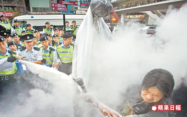 四五行動的十多名示威者,昨早7時在灣仔家計會外集合,擬遊行至金紫荊廣場示威,更抬着棺木打算送給國家主席胡錦濤。港府為免着力營造的和諧氣氛遭受破壞,出動近百名警員在起步點嚴陣佈防,更罕有地檢查示威者「裝備」,將棺木翻開,並要求拆除棺木內的布條。四五行動成員拆除布條後,在警方重重包圍下出發,沿途有不少機動部隊警員戒備,全程負責「招待」長毛等示威者的警員總數逾百。