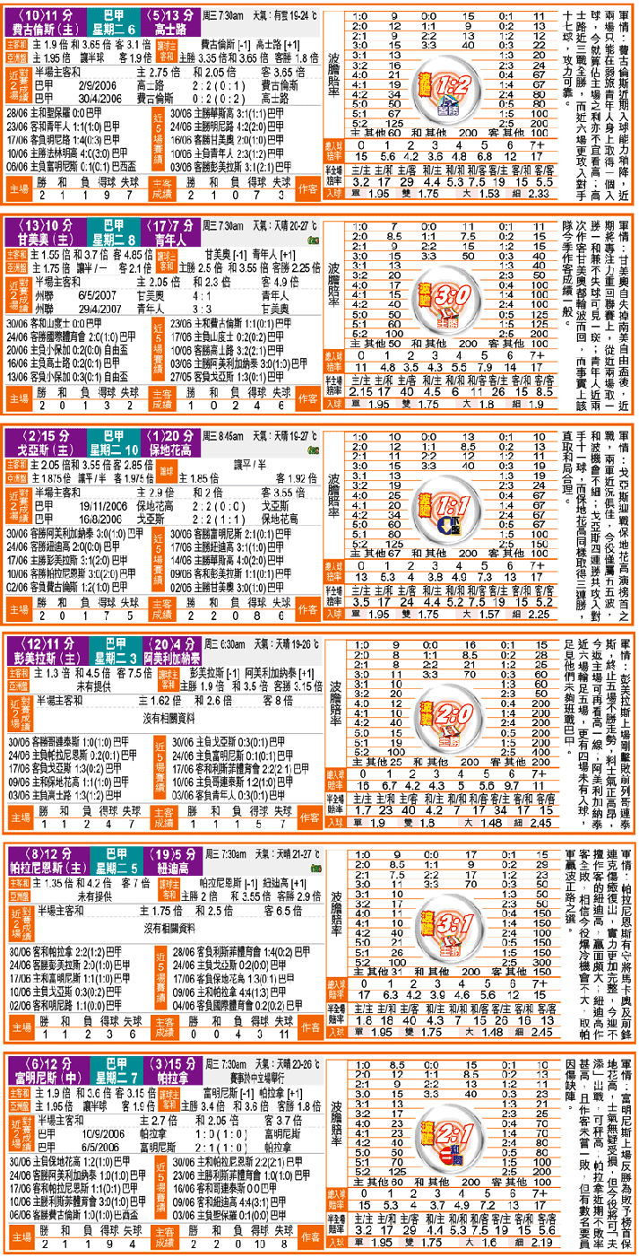主客和:星期二3彭美拉斯勝(1.3)x星期二8甘美奧勝(1.55)2x1