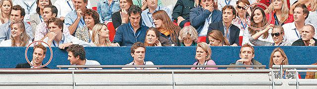 在戴妃紀念音樂會這個重要日子,威廉舊愛凱蒂是否捧場、兩人是否和好,成為傳媒焦點。英國《世界新聞報》報道,兩人4月時宣佈分手,只是一場戲,好讓二人避開訂婚傳聞、脫離緊盯的傳媒,轉為地下情。當人人以為兩人分手了,他們四天後已經又走在一起甜蜜蜜了。但昨日音樂會上兩人坐到「離行離列」(紅圈示)。 路透社