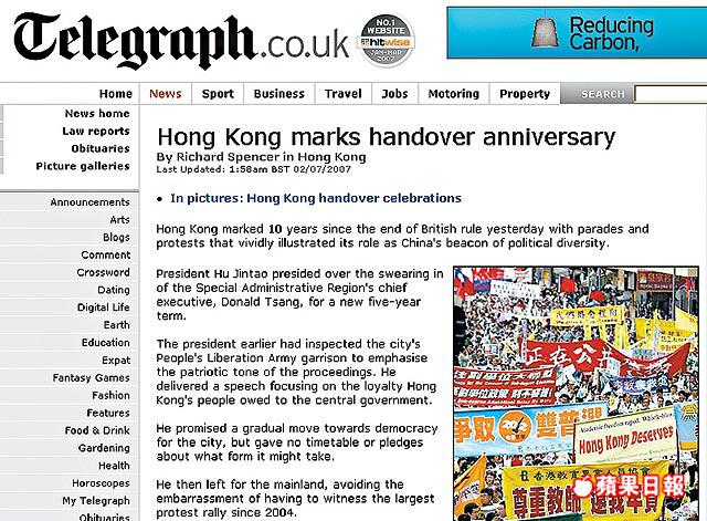 《每日電訊報》則指,經過回歸10年,香港仍然是富裕的城市,有些市民歡迎回歸,但也有市民仍然擔心,北京未能履行承諾,讓香港實行普選,由於沒有民主制度保障,法治和自由可能會受影響,但7.1遊行說明香港仍然是多元社會。
