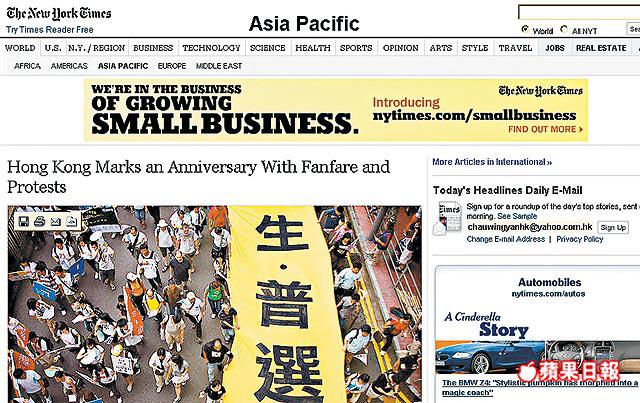 【本報訊】《紐約時報》以「香港以歡呼及抗議慶祝回歸」為題,大篇幅講述天主教香港教區主教陳日君樞機首次7.1上街;英國《每日電訊報》則以「香港的回歸紀念」為題,指本年7.1遊行是繼04年後規模最大的一次,令國家主席胡錦濤也要在遊行前返回內地,避免尷尬。