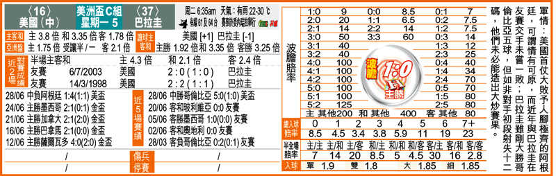 往績方面,美國近年於友賽與巴拉圭交手3次,錄得1勝2和不敗賽果。再者,美國如要出線今役務必爭勝,料可給對手一定壓力;反觀巴拉圭只要不負於美國,基本上晉級8強機會極濃。因此,在兩軍可「夫添」情況下,美國不一定輸硬,[+1]的1.92倍「主勝」抵捧。