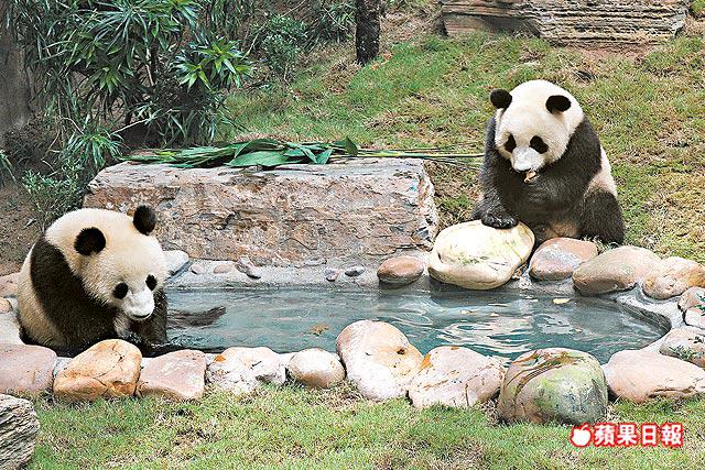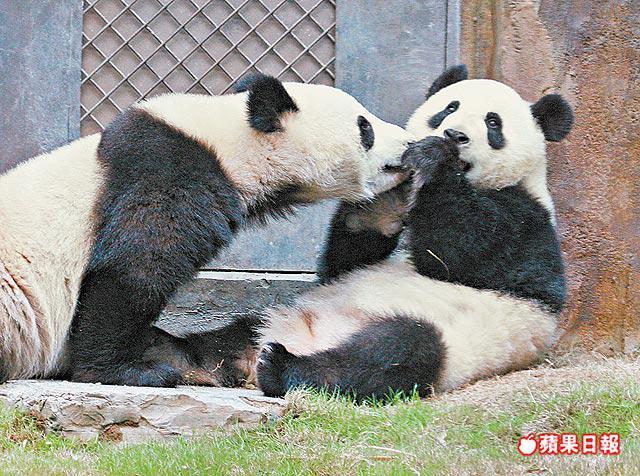 樂樂及盈盈昨日表現活潑,一時親密依偎,一時鴛鴦嬉水,樂樂更會突然向盈盈索吻;當遊人看着樂樂圍着水池跑來跑去時,盈盈已悄悄跑到樹上,懶洋洋地看着遊人,兩位國寶的好動性格也「苦了」工作人員,因居所前面的矮樹都給撕個稀爛。
