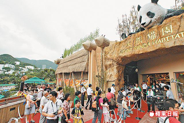 【本報訊】國寶大熊貓樂樂及盈盈千呼萬喚始出來,昨日首度公開露面,吸引數以萬計遊人湧入海洋公園的全新「大熊貓園」,他們平均輪候半小時就可一睹其風采,但部份人不但喧嘩,更違規以閃光燈拍攝,樂樂則送上「黃金」作見面禮,即場出恭。 記者:黃嘉寶、翁煜雄