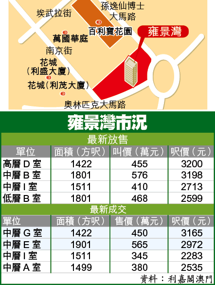 氹仔雍景灣樓齡僅2年,眺望被喻為澳門八景之一的龍環圃韻(博物館),以及大片綠化公園地和遠海景,單位面積較大,由1400方呎起。物業合共3座,以弧形排列,加上位處單邊,逾半數單位均可享開揚景致。物業以觀景及樓齡取勝,堪稱氹仔地標樓盤之一。大廈門前設有巴士站,沿途亦設有商舖、食肆,起居堪稱便利。