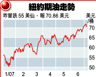 【本報綜合報道】美國第四大原油入口供應國尼日利亞又再出現暴動,加上美國第二大煉油商ConocoPhillips設於德州的煉油廠出現機械故障,或會影響美國燃油供應,紐約油價昨曾突破每桶72美元,但其後由於原油庫存多於預期,油價於紐約早段倒跌。截至本港時間11時,紐約期油報70.86美元,倒跌55美仙。