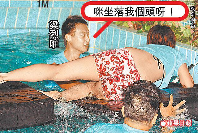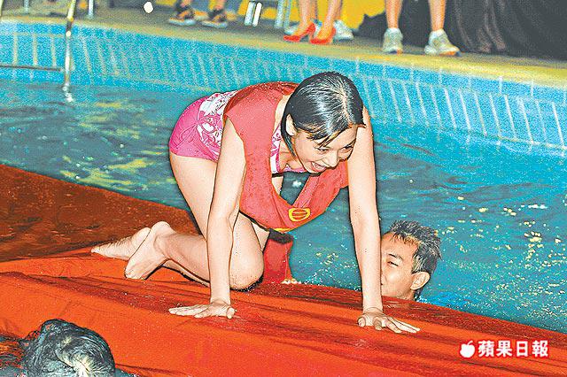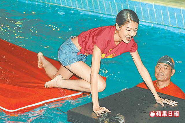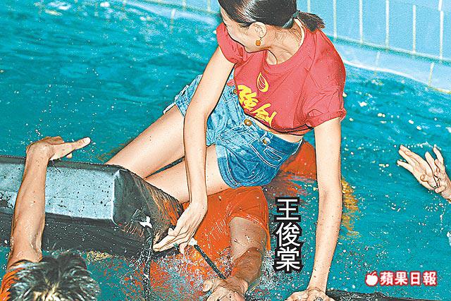 新劇《強劍》一眾演員昨日穿上泳裝玩水上遊戲宣傳,陳敏之在玩遊戲時,陰差陽錯跣腳騎在王俊棠頭上,兩人尷尬得極速彈開,而向海嵐也跣腳,幾經掙扎後仍跌落泳池,露出半截玉背,狼狽非常。