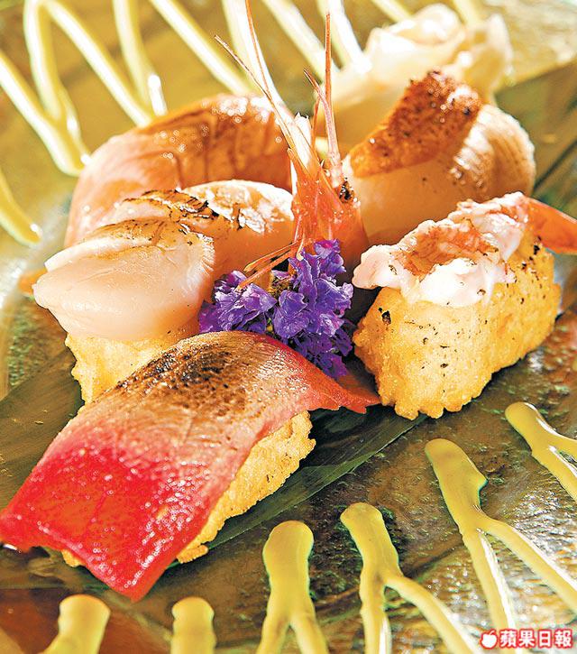 飯糰蘸上脆漿再炸至外脆內軟,焦香煙韌。魚生有吞拿魚、魷魚、海膽、甜蝦和帶子,統統以火炙直接輕燙,令肉質更結實惹味,吃時蘸上碟邊的芥辣沙律醬,甜甜哋唔攻鼻!