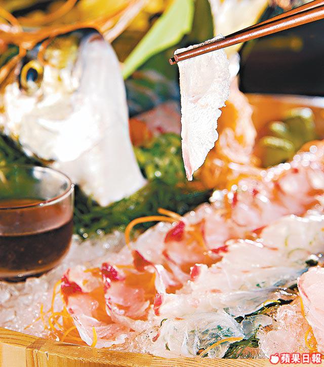 活魚薄切,先要避開脊骨位的大動脈,再因應魚的肌理來切,時間、速度全要控制得準確,魚上枱時依然活生生!晶瑩剔透的魚片,伴以秘製清酒汁,酸酸咪咪,令肉質更爽脆鮮甜。