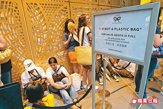 「一個環保袋賣120蚊,𠵱家網上炒到1,200蚊,你話點會唔瘋狂。」在中環置地廣場ThreeSixty門外排了12小時的陳小姐說,較早前,雜誌報章一窩蜂地報道英國名牌AnyaHindmarch一款價值120元的限量版環保袋「I'mNOTAPlasticbag」,並預告今日上午11時在中環、銅鑼灣和尖沙嘴的四家分店及位於置地廣場的高檔超市ThreeSixty公開發售。