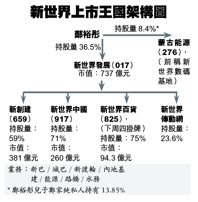 今年82歲的鄭裕彤,於43年娶家族世交黃金商人周至元之女周翠英,繼承經營珠寶生意的周大福。70年,彤叔創立新世界發展,旗下有新創建、新世界中國及新世界百貨,四間上市公司的市值合共1,472億元,業務遍及中港地產、基建、百貨、本地巴士及渡輪。