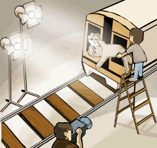 1、2、3!10多盞太陽燈同時亮着,一次過照着火車,同一時間「屍體」被掟落火車軌,那火車司機開車中途突然眼前一花,甚麼都看不見,嚇得他即時緊急煞掣,幾乎搞到火車出軌。