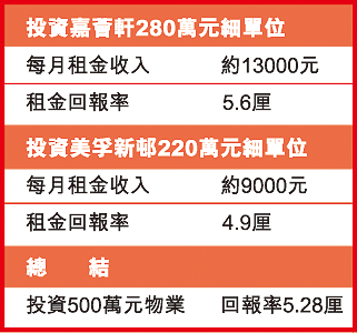總結以上多個入市方案,張錦成認為,其實如果有500萬元現金在手,建議可分散投資,假設將500萬元現金以一次過付款買入280萬元的嘉薈軒細單位,餘下220萬元再買美孚新邨細單位,以穩中求勝。