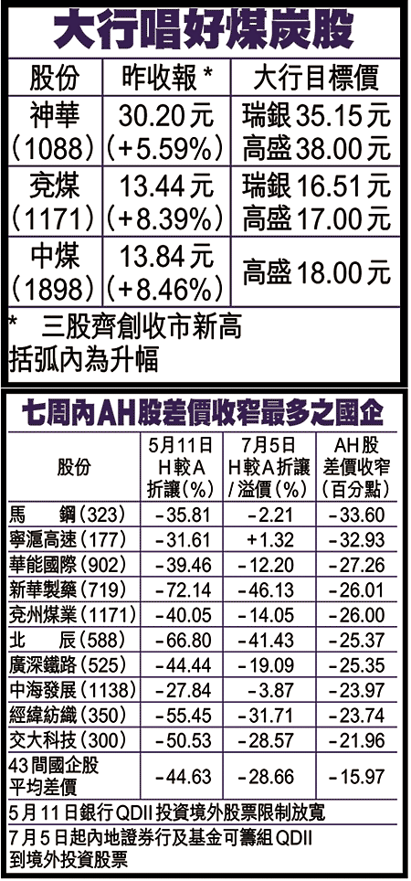 事實上,一直成為中資股炒作藉口的A、H差價問題,近日已大幅縮窄。本報統計由5月11日(即中央宣佈放寬銀行QDII可投資港股)至昨日為止,43間A、H股折讓差價平均由近45%,大幅降至昨日的29%,收窄幅度高達16個百分點。而昨日寧滬(177)H股股價更超越A股,海螺(914)AH股價則平手,而招行(3968)、馬鋼(323)、鞍鋼(347)及中海發展(1138),其H股較A股折讓幅度,由高峯期的8%至36%,收窄至現時全部在5%之內。