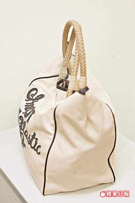 全城大熱的AnyaHindmarch環保袋,長約12吋、寬約7吋半、高約12吋,袋內全無間隔,容量十足,是名副其實的購物袋。香港版全袋以米白色帆布製作,雖然只賣120元,但把手以金屬圈配麻繩,袋邊還包上深灰色布邊,上面的「I'mNOTAPlasticbag」字樣,以灰布剪出縫在袋面上,頗花心思及手工。