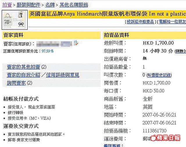 其實英國設計師AnyaHindmarch這個以推廣環保平價發售的環保袋,之前在英國以約90港元開售時,即火速掀起炒風。香港版、台灣版、星馬版及內地版,全採用灰色字體,雖然港版加價至120元,但未發售已在香港雅虎網上炒賣至800至1200元;啡色字的英國版則炒風繼續,炒價高達1700元。日本版將於下周六(14日)在當地開售,袋身字體為綠色,相信撲袋炒風將會更盛。