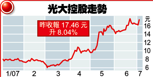 【本報訊】《中國證券報》報道,光大控股(165)持有46.6%權益的光大證券,今年上半年稅前利潤達32.47億元(人民幣‧下同),按年增長近9倍。受消息刺激,光大控股昨日收報17.46港元,升8.04%。光大證券上半年實現營業收入(含投資收益)達46.58億元,激增5.43倍。期內完成股票基金權證交易1.7萬億元,實現收入16.96億元,市場佔有率3.25%。