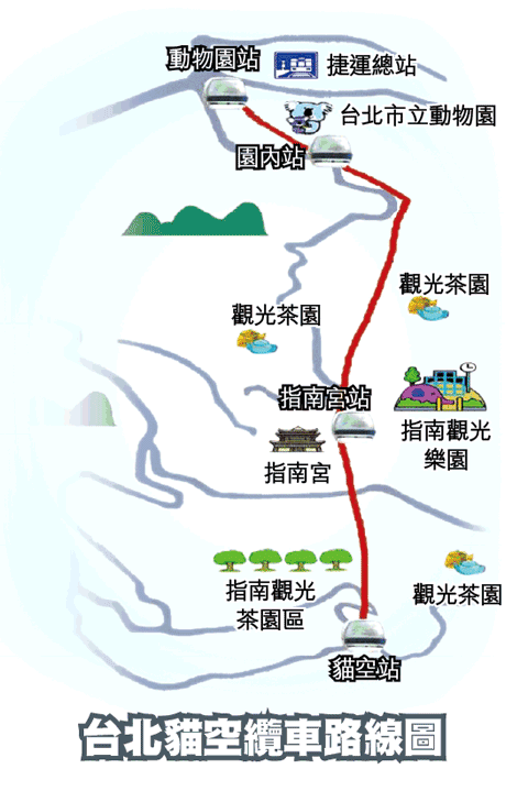 耗資13億新台幣(約3.1億港元)興建的貓空纜車,全長4.03公里,以平均每秒3至5米速度,穿梭在台北木柵山區高空,全程共有動物園、園內、指南宮及貓空四個站。