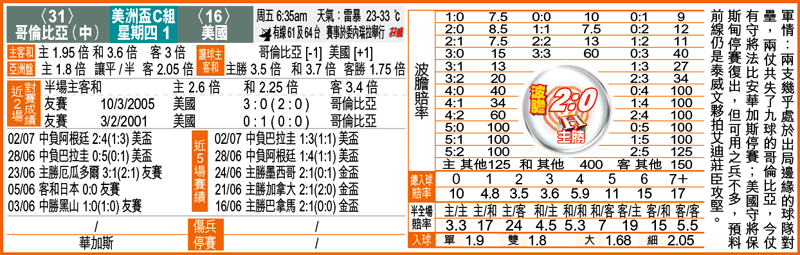 美洲國家盃C組,兩支非勝不可的球隊周四相遇,哥倫比亞質素稍勝派出B隊赴會的美國,1.95倍單W安枕無憂,或進取補注[-1]的「主勝」。(球賽編號:星期四1;有線61及64台明日6:35am直播)