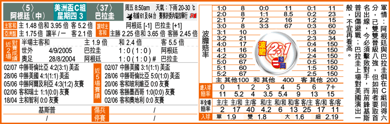 我信阿根廷會沿用首兩場贏波的陣容,就算臨場有變,一眾質高二線兵仍可擔大旗,1.48倍W可作過關膽。考慮到巴拉圭兩場分組賽共入8球之多,而阿根廷防線亦未算太過牢固,「讓球主客和」阿軍[-1],可一試有3.65倍的「和局」。