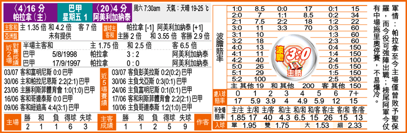 周五巴甲獨腳戲帕拉拿迎戰阿美利加納泰,後者正陷頹勢兼有主力停賽及受傷缺陣,今仗應未到反底之時,宜從正路思維出發,吼帕拉拿W,補[-1]的「主勝」。(球賽編號:星期五1;香港時間明日7:30am開賽)