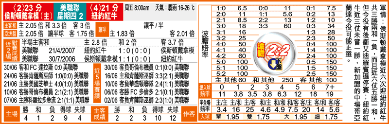 至於有主場之利兼於西岸排第2位的侯斯頓戴拿模,論近況他們確是「弗到漏油」,對上6場聯賽取得5勝1和;此外,近年他們迎戰紅牛的成績亦好,6戰錄得3勝2和1負。可是,今仗他們有中場靈魂列卡度奇勒及主力後衞艾廸羅賓遜分別因踢美洲盃及停賽而缺陣,整體實力難免受到影響,加上他們今屆對東岸球隊表現平平,7戰取得2勝5負,贏波率得29%,故未必能殺退紅牛。