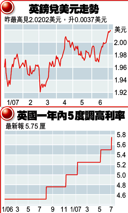 【本報綜合報道】英倫銀行在發表的聲明中指出,雖然工資壓力持續放緩,但企業剩餘產能有限,亦有不少數據反映物價有升溫壓力,故中期而言,通脹仍具加劇風險。因此,該行將基準利率調高0.25厘,至5.75厘,為2001年4月以來最高,亦是該行過去一年第5度加息。