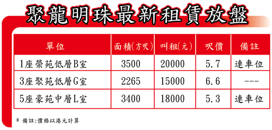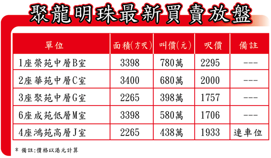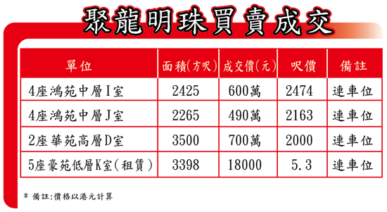 據中原(澳門)最新成交報告顯示,聚龍明珠建築面積2265方呎中層單位及2425方呎連車位的中層單位,成交價分別為490萬元及600萬元,另建築面積3500方呎連車位的高層單位,成交價為700萬元,而建築面積3398方呎連車位的低層單位,承租價為18,000元。氹仔區豪宅前景備受看好,不少投資者正趁機入巿迎接未來升幅。