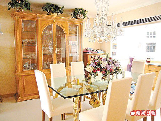 是次推介的單位為2座中層D室,面積3500方呎,間隔4房2廳,連2間工人房。客廳間隔四正,設計豪華典雅,配以紅黃間條的布藝梳化,更添一份歐陸色彩。梳化背後安裝入牆櫃,慳位實用之餘,最適合放置家庭合照,盡顯溫馨暖意。飯廳寬敞闊落,長形飯檯上的水晶燈華麗典雅,客飯廳均設大窗口位,令室內光線充足,感覺開揚通爽。