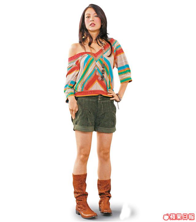 Diesel彩間V領Top$1,190、墨綠色燈芯絨短褲$1,190及啡色長Boot$2,580(k)