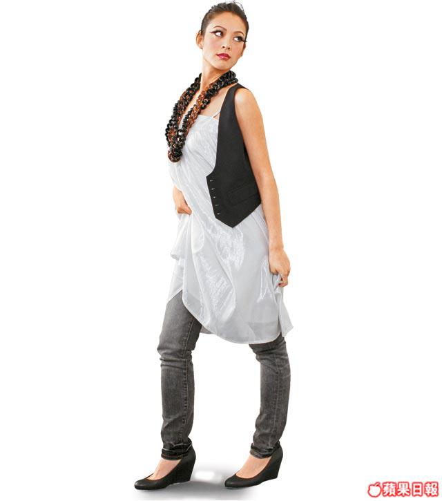 Izzue銀白色吊帶One-piece裙$1,099、黑色洗水牛仔褲$699、黑色Wedge高踭鞋$699及黑色背心外套$699(e)