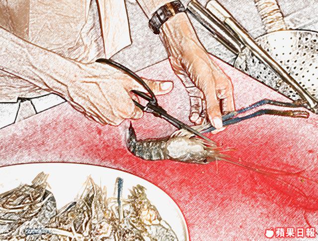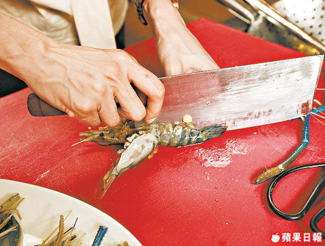 看大頭蝦的前腳多長多糾纏!記者雖然也下廚,惟獨對這個投降,但Eunis卻一板一眼的將蝦解構,先去腳,再慢慢斬開,輕鬆非常,服!