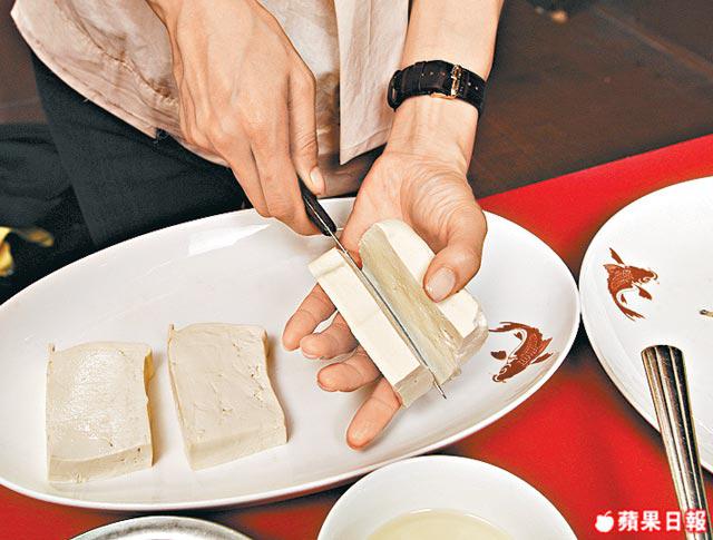 看Eunis把豆腐放手掌上直接用細刀切4份,就知她入慣廚,生手的人多會驚用刀。