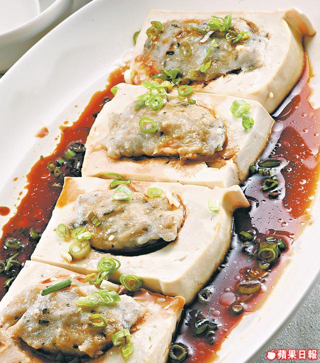 鯪魚肉加入醃料,順時針方向攪拌至起膠後備用。硬豆腐分4件,在中間以湯匙挖一個洞,拍上生粉後釀入魚肉。豆腐蒸8分鐘取出後倒去多餘水份,趁熱淋上調味汁,灑上葱花即可。