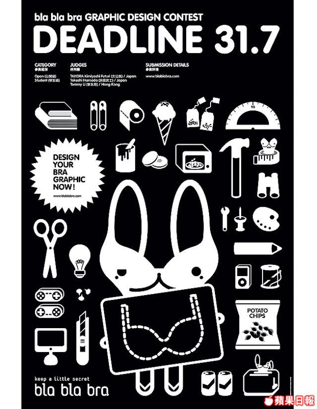 坊間流行自家設計,T恤首當其衝,大街小巷都有自家設計,今次由blablabra帶起另一設計潮流,舉行首屆「blablabraGraphicDesignContest」,比賽由即日起至7月31日,分「公開組」及「學生組」,各參賽者以主題「Cheers」創作出不同的BraGraphics,為Bra設計不同的圖案。大會評判為日籍設計師太公良、浜田武士及香港著名設計師李永銓先生,有意參加blablabra內衣設計,詳情可瀏覽: http://www.blablabra.com。
