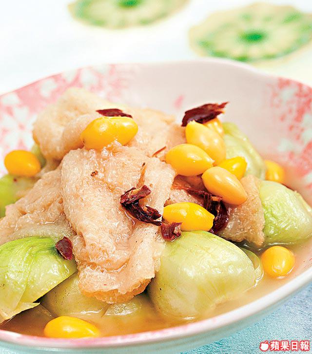 材料:白菜200克(洗淨)、竹笙15條(浸軟切頭尾)、銀杏10粒(去芯)、冬菇1/2盒、蒜頭2粒(壓扁)、薑2片、清雞湯11/2杯