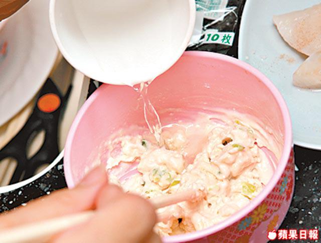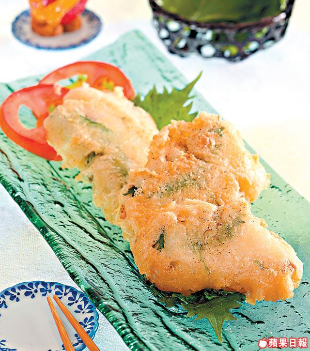 炸漿:炸粉4湯匙、冰水1/3杯、鹽1/2茶匙、生油1湯匙、葱粒1棵