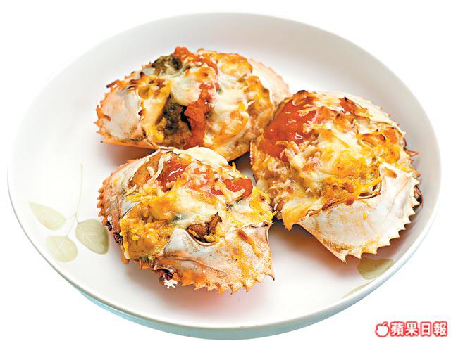 膏蟹洗淨去鰓,取出蟹膏。蟹身/蟹蓋隔水蒸10分鐘,待涼後拆肉。免治豬肉用醃料醃15分鐘,燒熱油爆香免治豬肉,之後和蟹肉/蛋黃/調味拌勻,釀入蟹蓋,隔水以大火蒸8分鐘。面頭灑上芝士放焗爐以180度焗5分鐘。