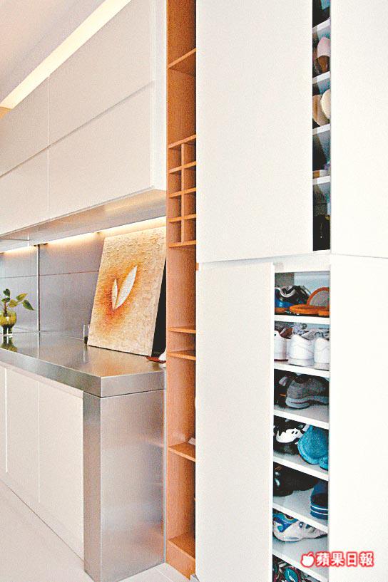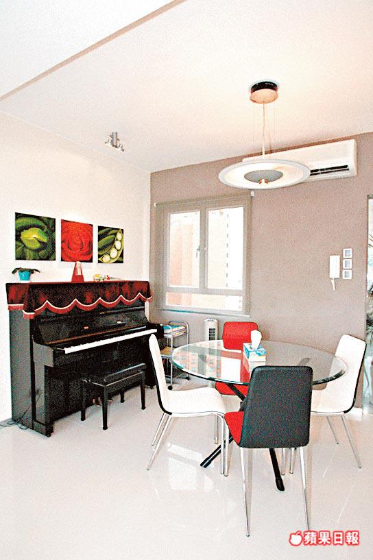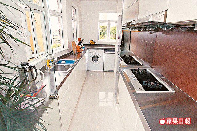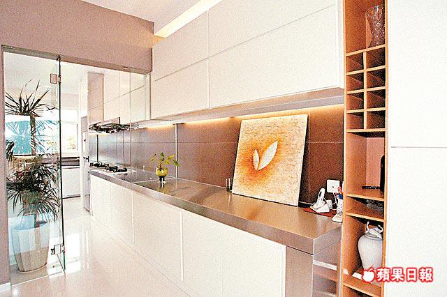 沒有濃妝艷抹,單位輪廓清晰分明,看上去非常寬敞。再者,拆去廚房間隔牆,改用玻璃屏,倍感通透玲瓏,加上飯廳地櫃鋪不銹鋼枱面,模樣與廚房地櫃相同,視覺交錯,誤以為廚房搬了出來,內外空間融為一體,地方更大。