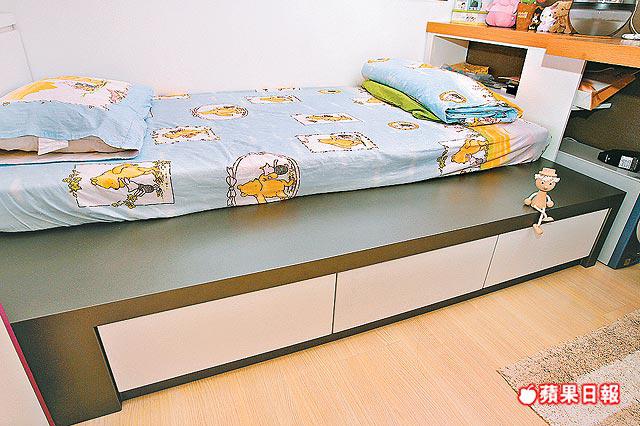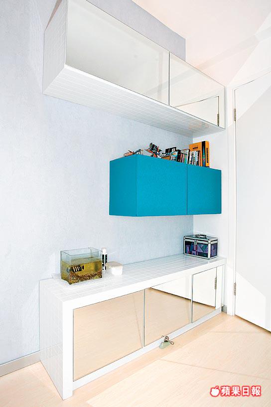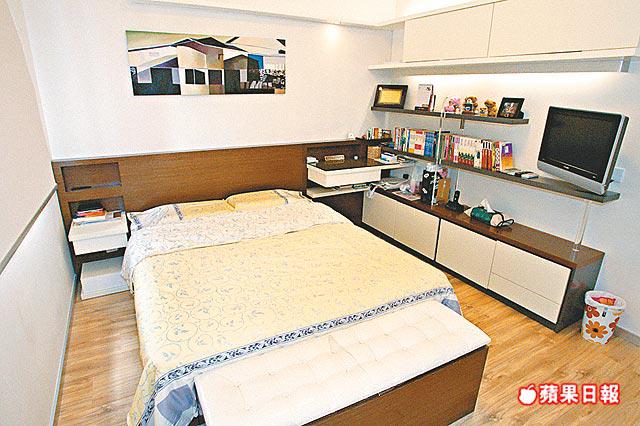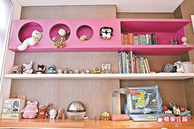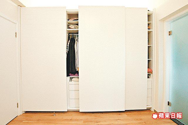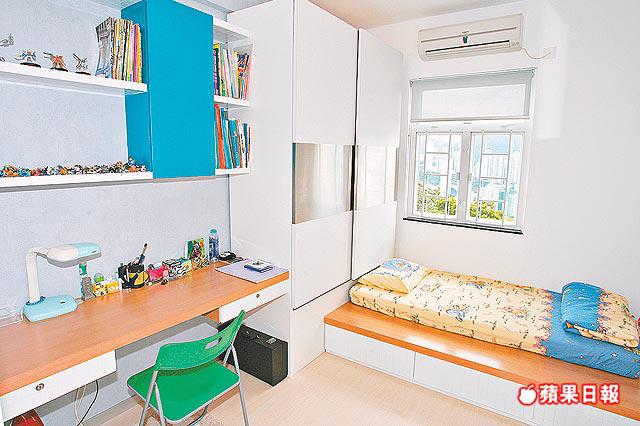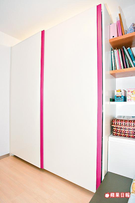 3房佈局簡潔,訂做基本家具,衣櫃不設手把,僅以凹槽推拉趟門,櫃頂不高至天花,刻意留空鑲照明燈,散發微弱光線,營造時尚格調。其中兩間細房稍有變奏,改用桃紅及粉藍色,以迎合年輕人的活潑個性,營造個人天地。值得一提,這兩房床架特意造大,擺放單人床褥後,尚餘1呎闊床邊空位,讓他們邀請同學朋友在房中聊天共聚,也坐得輕鬆愜意。