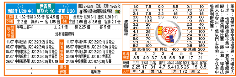 西班牙贏面較高,理可於法定時間內收拾對手,惟捷克硬淨爛打,[-1]「主勝」不算穩,吼實「半全場」主/主(2.25倍)、和/主(4.7倍)夠數。