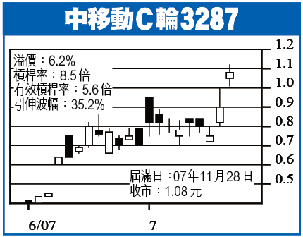 中移動C輪3287:中移動(941)前日創新高試90元,大行紛紛調高目標價,昨日股價繼續醒神,最高升上92.70元,收市報91.95元,Keep住個靚靚嘅走勢,短線目標係100元,破位就推向110元,可以買啲中移動C輪3287。隻輪昨收1.08元,槓桿率8.5倍(有效5.6倍),正股升上100元同110元,3287應該喺1.66元同2.50元樓上,正股跌穿88元止蝕。