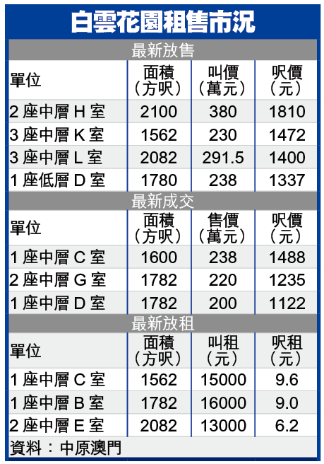 近年澳門北區多座新型豪宅相繼推出,帶動該區二手樓價上揚,其中屬老牌名廈的白雲花園,鄰近友誼橋大馬路,享單邊開揚地利,大部份單位坐擁全海景,交通亦便捷,臨近關閘口岸,方便往返內地及澳門,加上該區將為澳門輕軌落腳點之一,別具發展潛力。