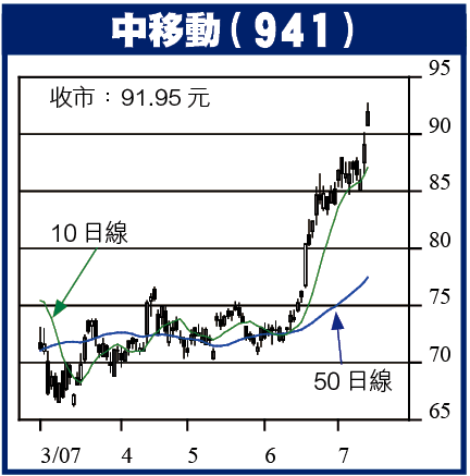 筆者相信短期內另一隻有機會成為「百元股」的是中國移動(941),上周再度發力成為恒指上升的主要貢獻者,這除與市場憧憬其回歸A股上市之外,與在港上市的4間中資電訊股作出人事調動亦有一定關係。