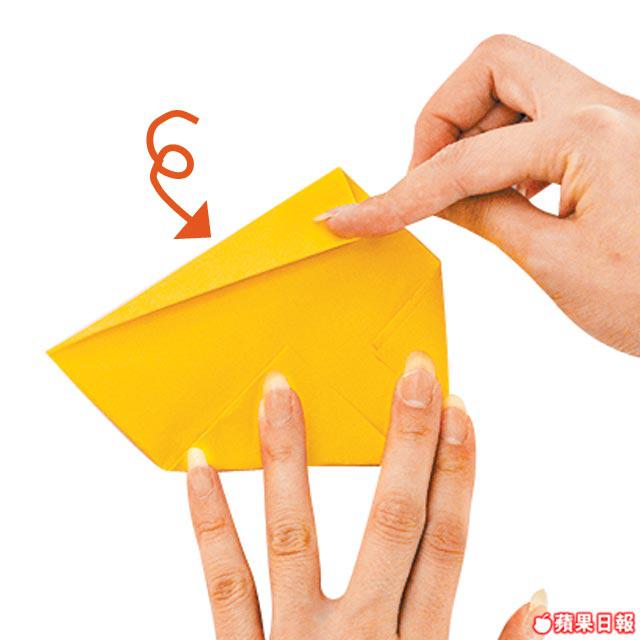 2.把右上角及右下角如圖向上摺起,密口一邊亦沿圖中虛線向上摺好。